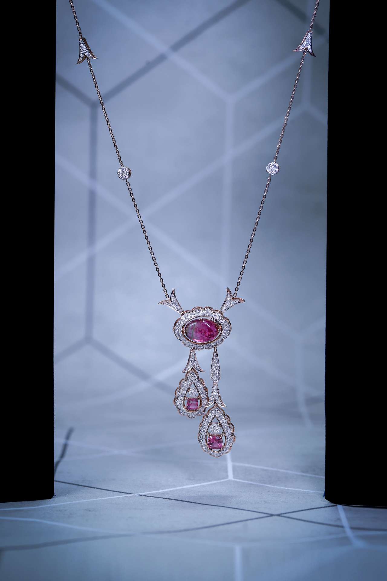 Necklaces of enduring design, meticulously adorned with select, elegant colored stones. Sculpturally weightless, intrinsically graceful, and conveying effortless luxury, these pieces are crafted for the discerning patron who seeks sublime beauty integrated with daily sophistication.
